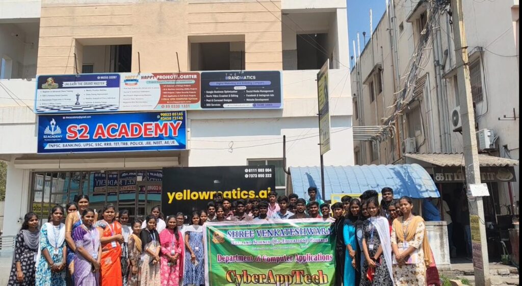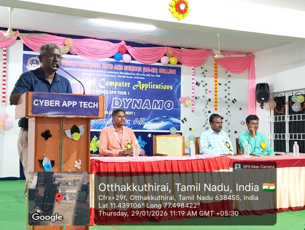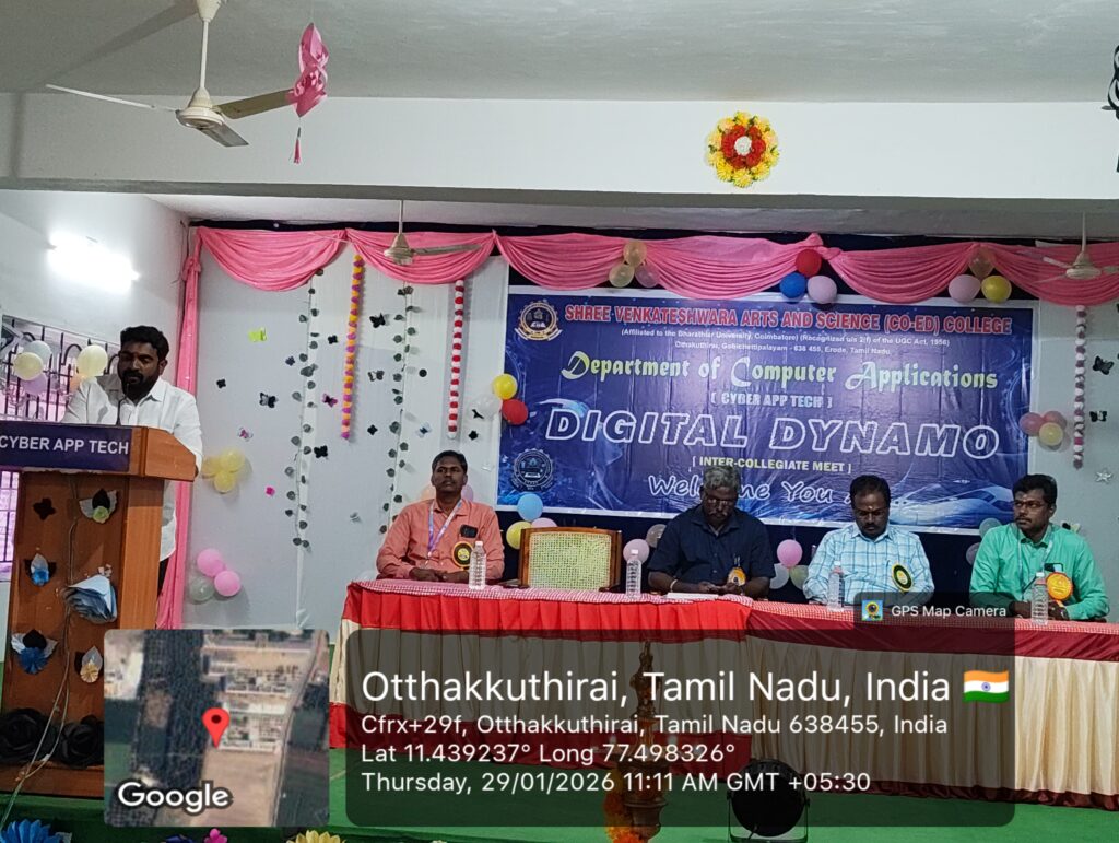 The Department of Computer Applications, Cyber App Tech of Shree Venkateshwara Arts and Science College organized a state-level inter-collegiate meet titled “Digital Dynamo 2K25” focused on BCA / IT/ Cybersecurity. The event took place on January 29, 2025, at 9:30 AM in the college auditorium. Ms. S. Kiruba from Yellowmatics Pvt Ltd served as the chief guest. The event was attended by college dignitaries including the Secretary, Chairman, CEO, Principal, Vice-Principal, and HOD