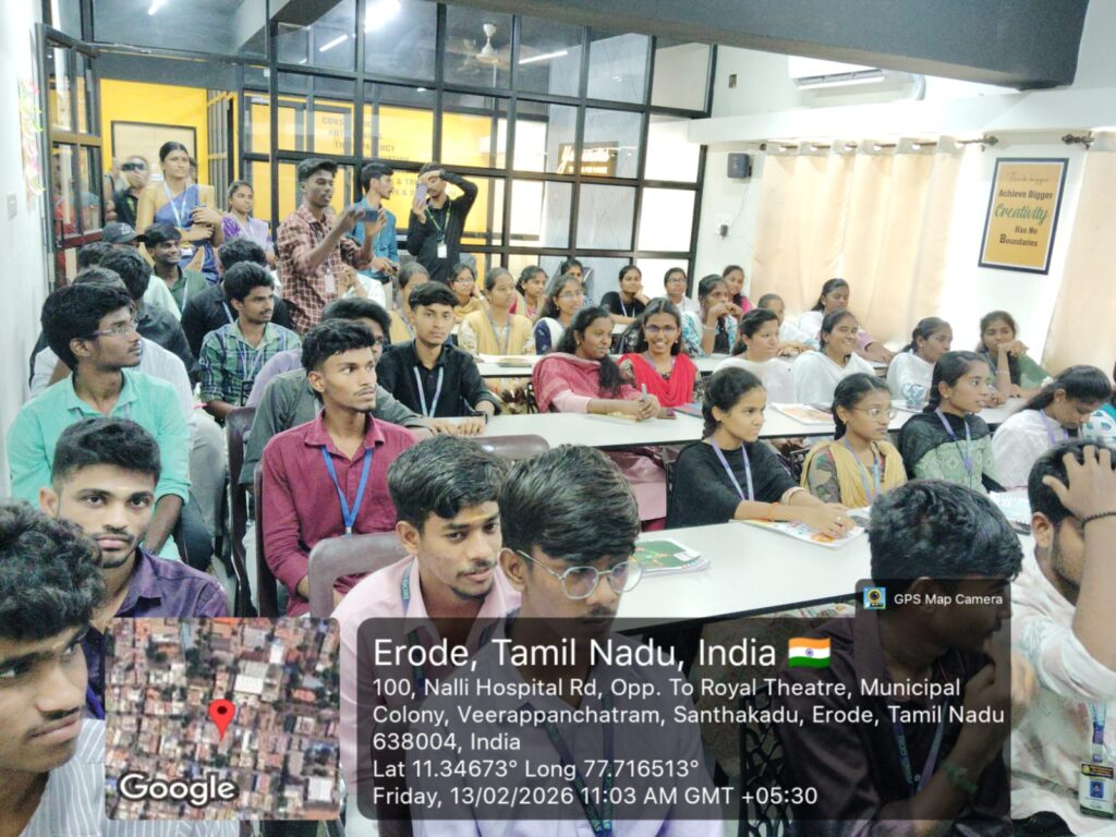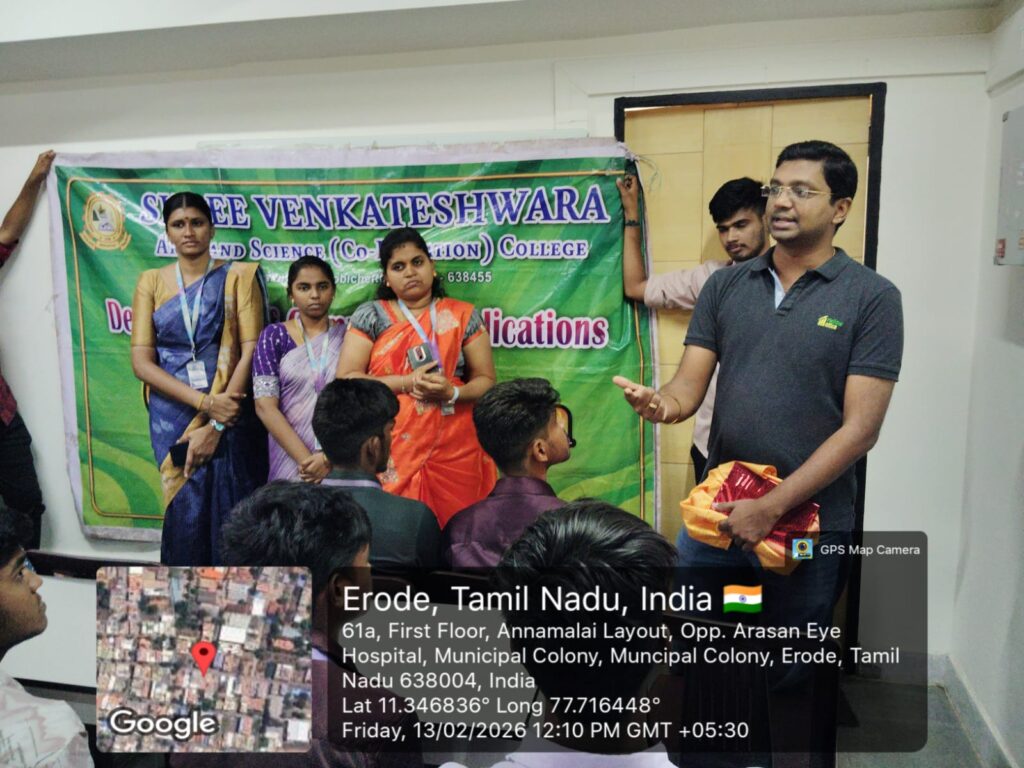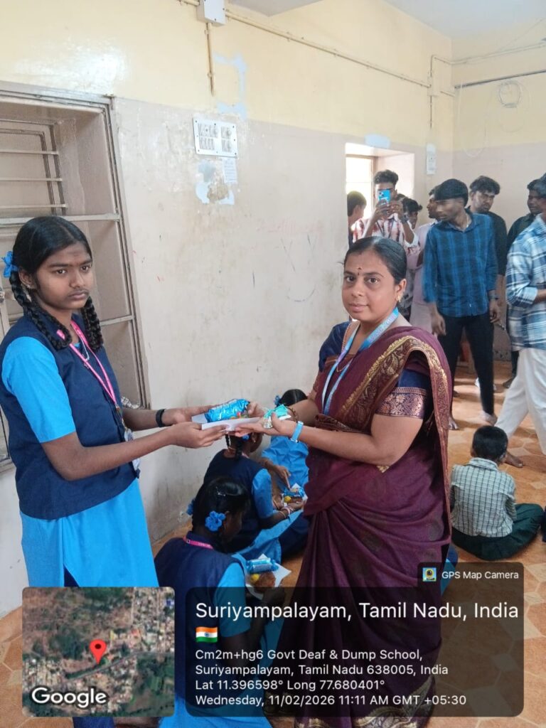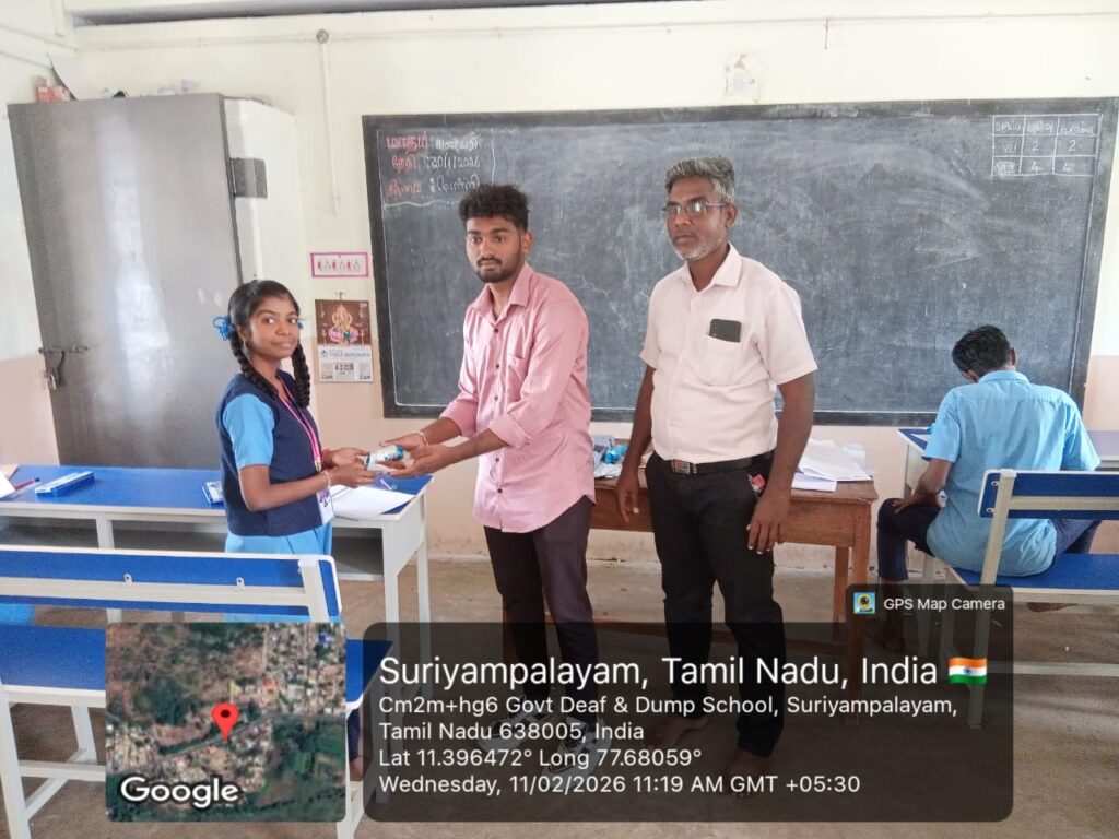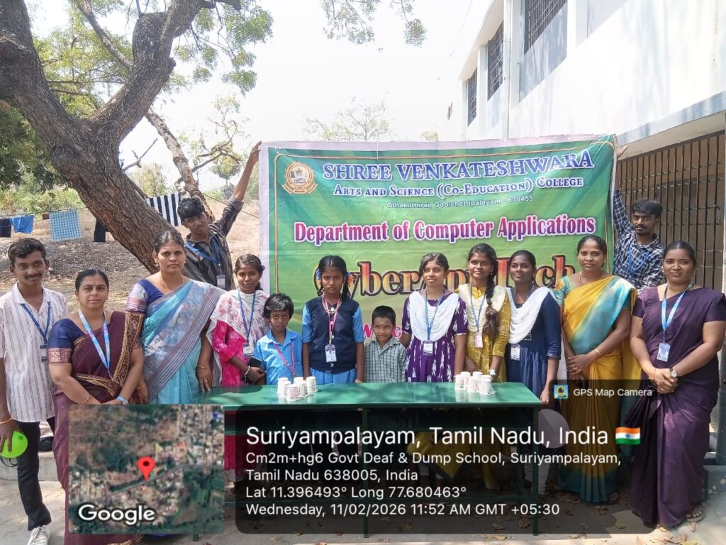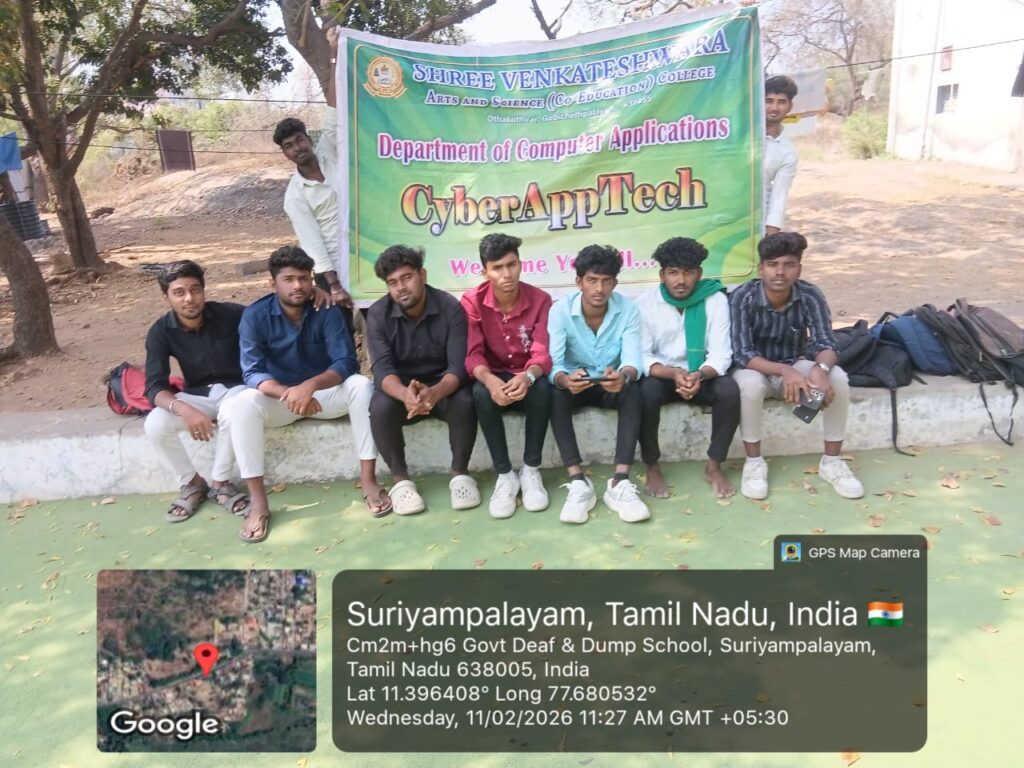 The Department of Computer Applications organized an Extension Activity Programme at Government Higher Secondary School for the Hearing Impaired, RN Pudur, Erode, on 11 February 2026. The event began with a welcome address by the Headmaster, Mr. P. Subash Chandrabose, followed by an introduction highlighting the importance of social responsibility among students.