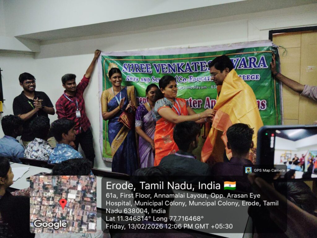The Department of Computer Applications (Cyber App Tech) at Shree Venkateshwara Arts and Science (Co-Ed) College organized its Association Inauguration and Freshers Day on 25th July 2025 at 9.30 AM in the college auditorium. The event was graced by distinguished chief guests from JCI Erode Metro – Jc. D. Navaneethakrishnan (President), Jc. R. Ravi (Vice President – Community), and Jc. K. Manikandan (Director), who shared inspiring thoughts and warmly welcomed the fresh batch of students. The program celebrated the beginning of a new academic journey for first-year students with enthusiastic participation and cultural events.