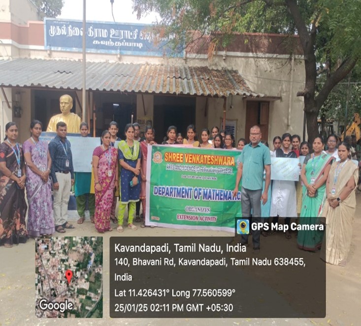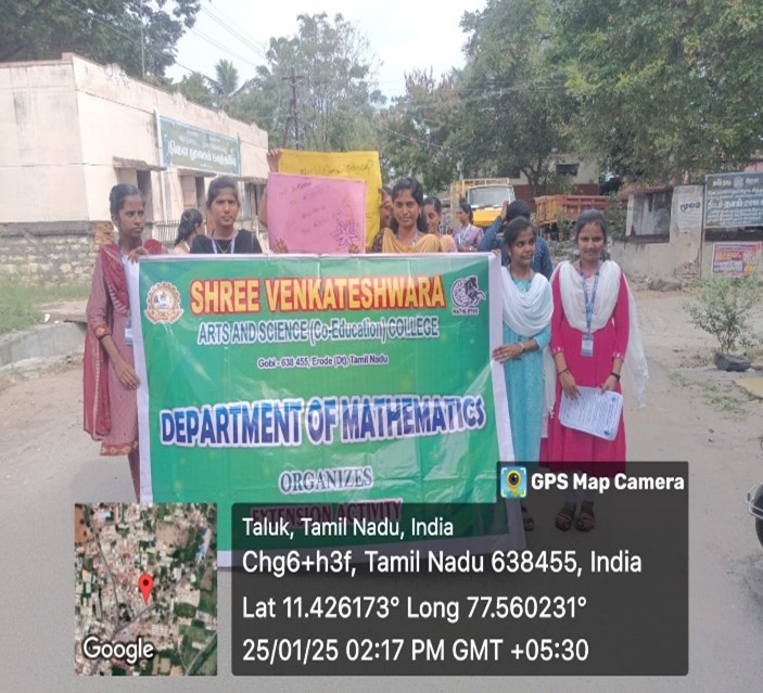 கணிதத்துறை சார்பாக கிராம சபைக் கூட்டத்தின் விழிப்புணர்வு பேரணி கிராம சபையில் இணைவோம்; உலக சபையில் ஒளிர்வோம்! என்னும் தலைப்பில் கவுந்தப்பாடி கிராம ஊராட்சியில் (25.01.2025) அன்று நடைபெற்றது. இப்பேரணியை கவுந்தப்பாடி கிராம ஊராட்சி தனி அலுவலர், கவுந்தப்பாடி கிராம ஊராட்சி செயலாளர், துணை வட்டார வளர்ச்சி அலுவலர், கல்லூரி முதல்வர் முனைவர் ஆ.மோகனசுந்தரம் மற்றும் துணை முதல்வர் முனைவர் சி.நஞ்சப்பா ஆகியோர் துவக்கி வைத்தனர். இப்பேரணி கவுந்தப்பாடி ஊராட்சி மன்றத்தில் தொடங்கி முக்கிய தெருக்கள் வழியாக வந்து இறுதியில் ஊராட்சி மன்றத்தில் நிறைவு பெற்றது. இப்பேரணியில் மாணவர்கள் அப்பகுதி மக்களுக்கு கிராம சபையில் பங்கேற்பதன் அவசியத்தையும் அதில் நிறைவேற்றப்படும் தீர்மானங்களின் முக்கியத்துவத்தையும் பதாகைகள் மூலம் தெரியப்படுத்தினர். இந்த விழிப்புணர்வு பேரணியை கணிதத்துறை உதவி பேராசிரியர்கள் ஆரோக்கியராஜ், கவிதா மற்றும் நாகரத்தினம் ஆகியோர் ஒருங்கிணைத்தனர். இப்பேரணியில் 35 மாணவர்கள் கலந்து கொண்டு விழிப்புணர்வை ஏற்படுத்தினர்.
