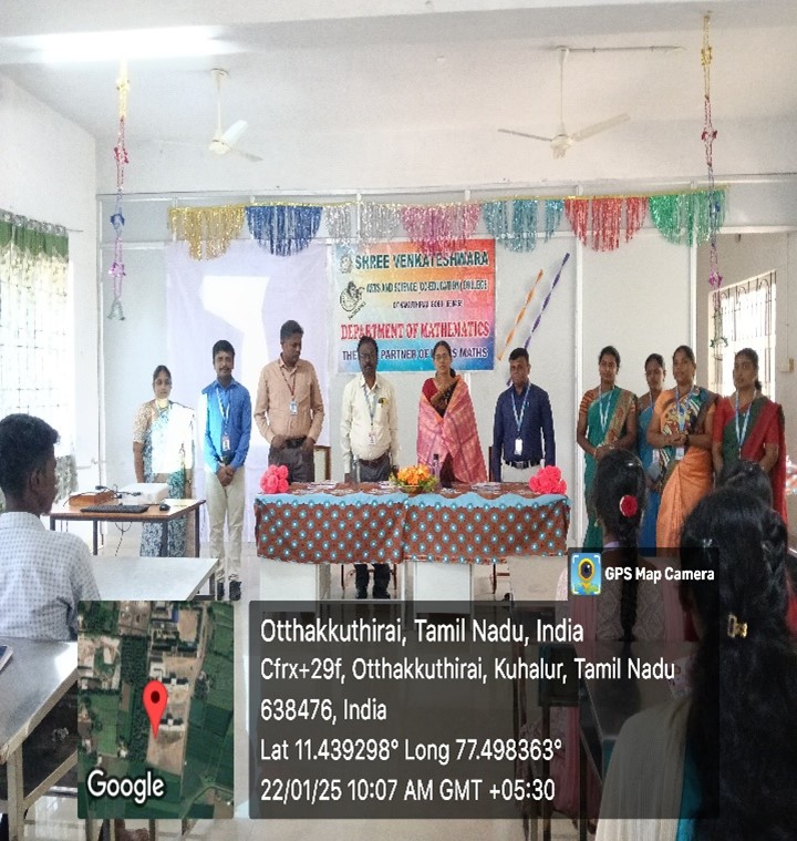 Department of Mathematics organized Seminar entitled “Artificial Intelligence in Mathematics” on 22.01.2025. Dr. A. Mohanasundaram, Principal delivered the presidential address. He emphasized the importance of Artificial Intelligence in Mathematics and its potential to revolutionize the field. Dr. CHI. Nanjappa, Vice Principal felicitated the programme. He discussed the latest advancements in AI. The chief guest introduction given by Mr. P. Arokyaraj Head and Department of Mathematics.