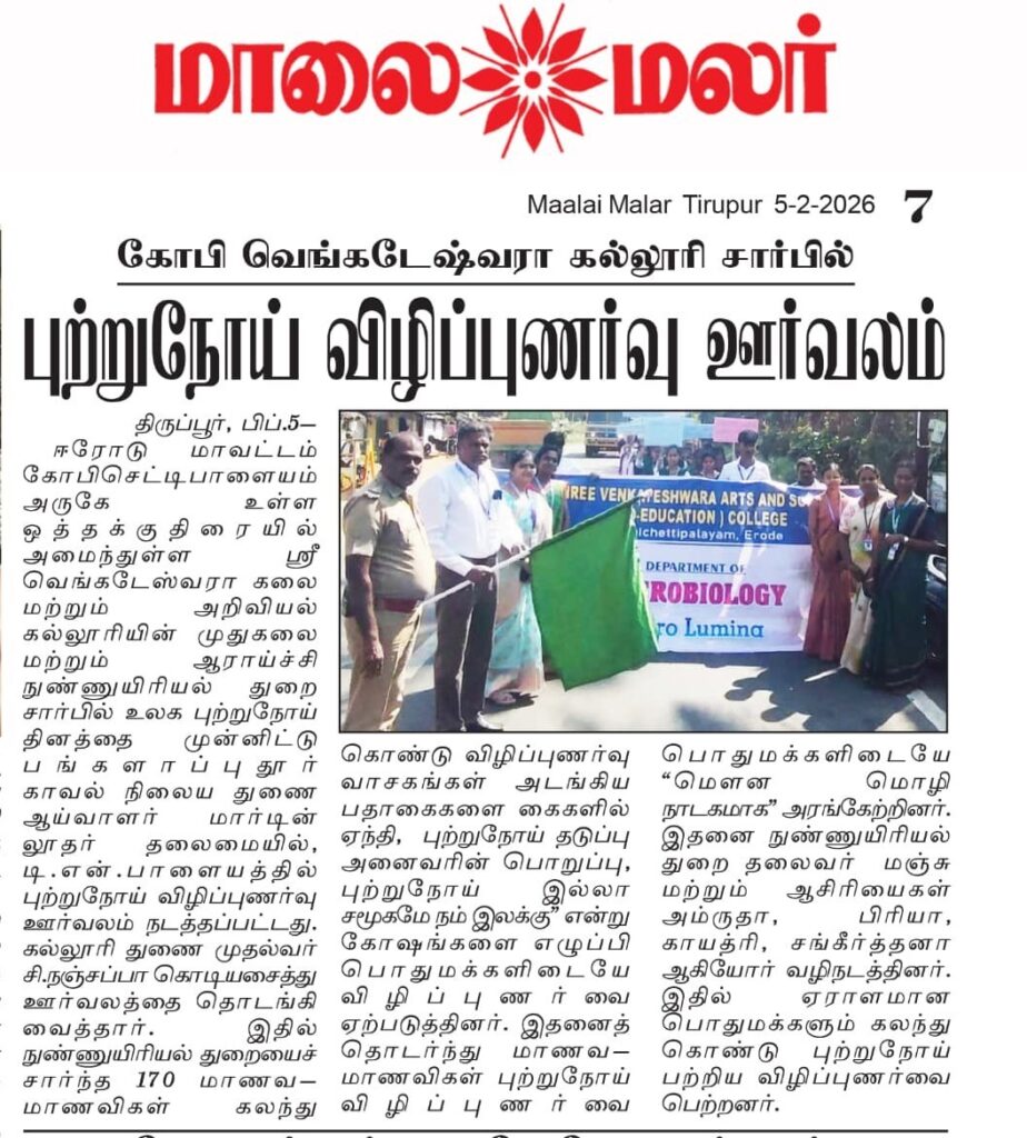 On the eve of World Cancer, Day Cancer Awareness Rally was organized on 04.02.26 at T.N palayam, Gobichettipalayam. Students also performed cancer awareness mime show.170 students and 5 faculty members participated in this event. The event was organized with the aim of spreading hope, responsibility and life saving awareness to the society.